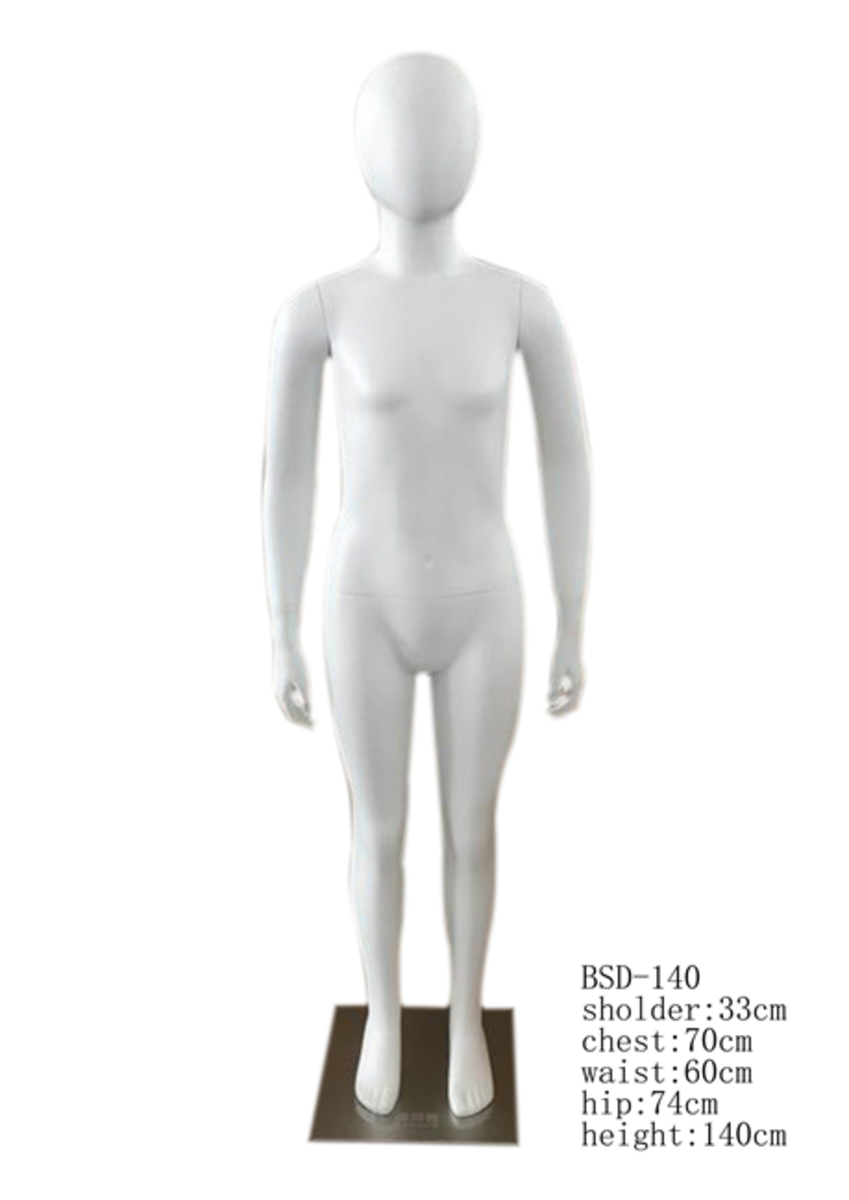 Fashion Full Body Child Mannequin for Clothing and Closet Displaying. Female mannequin, abstract head, 2 pairs of interchangeable feet, , FRP lacquered in white matt, incl. Round Base plate, foot, calf and thigh pin. The luxurious female full body mannequin with leisure standing pose. The upper half body carefully covered by linen which makes her premium and natural feeling. Simplified face weaken the mannequin itself but emphasize the clothing when display. She is the perfect option for retailing clothing on various style and add the atmosphere when put her with group in the window or store. If measurement or poses changed wanted, please feel free to contact to adjust or customized.