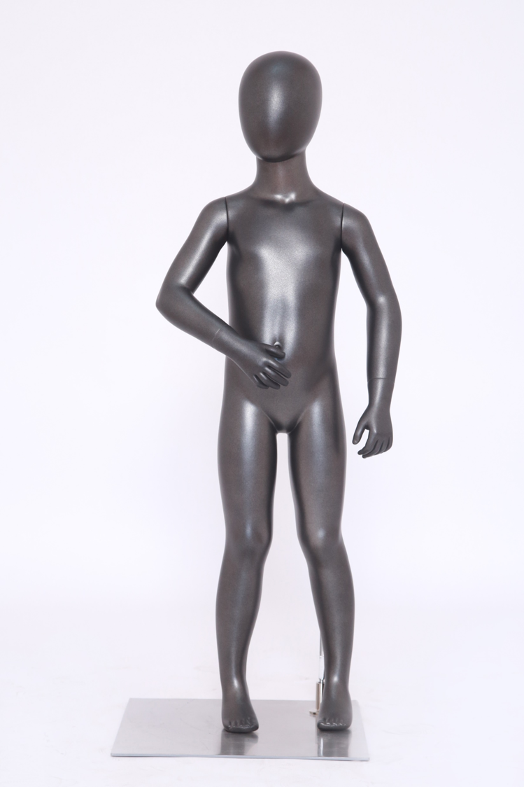 A child-size mannequin expertly crafted from fiberglass with a matte black finish, designed to represent a 7-year-old child with a height of 112 cm. Perfect for displaying children's fashion, accessories, school uniforms, sportswear, and youth-oriented products with authenticity and appeal. This model features proportional and realistic youthful proportions, optimized for showcasing kids' hats, sunglasses, backpacks, shoes, and seasonal apparel. The weighted reinforced base ensures stability while maintaining a natural, childlike posture. Manufactured from high-quality fiberglass, it combines durability with lightweight handling for easy adjustment and repositioning. Designed for children's boutiques, retail stores, and brands seeking to create engaging visual merchandising displays that reflect youthfulness and vitality. Ideal for window displays, photo shoots, and trade shows where relatable child mannequins enhance product presentation.