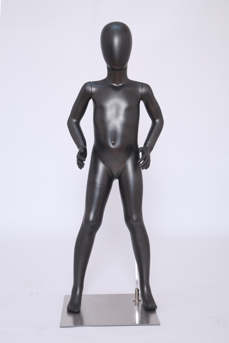 A precisely scaled child mannequin expertly crafted from fiberglass with a sophisticated matte black finish, representing a 9-year-old child with an accurate height of 125 cm. Perfect for displaying pre-teen fashion, school uniforms, athletic wear, and youth accessories with authentic proportions and contemporary appeal. This model features realistic youthful anatomy with age-appropriate proportions, optimized for showcasing children's eyewear, headphones, hats, jewelry, and seasonal accessories. The weighted stabilizer base ensures secure positioning on display counters while maintaining a natural, engaging posture. Manufactured from high-quality fiberglass, it combines impact-resistant durability with lightweight portability for effortless handling and repositioning. Designed for children's boutiques, department stores, and educational retailers seeking to create dynamic visual merchandising presentations that resonate with both parents and young consumers. Ideal for product photography, window displays, and trade exhibitions where realistic youth representation enhances commercial appeal.