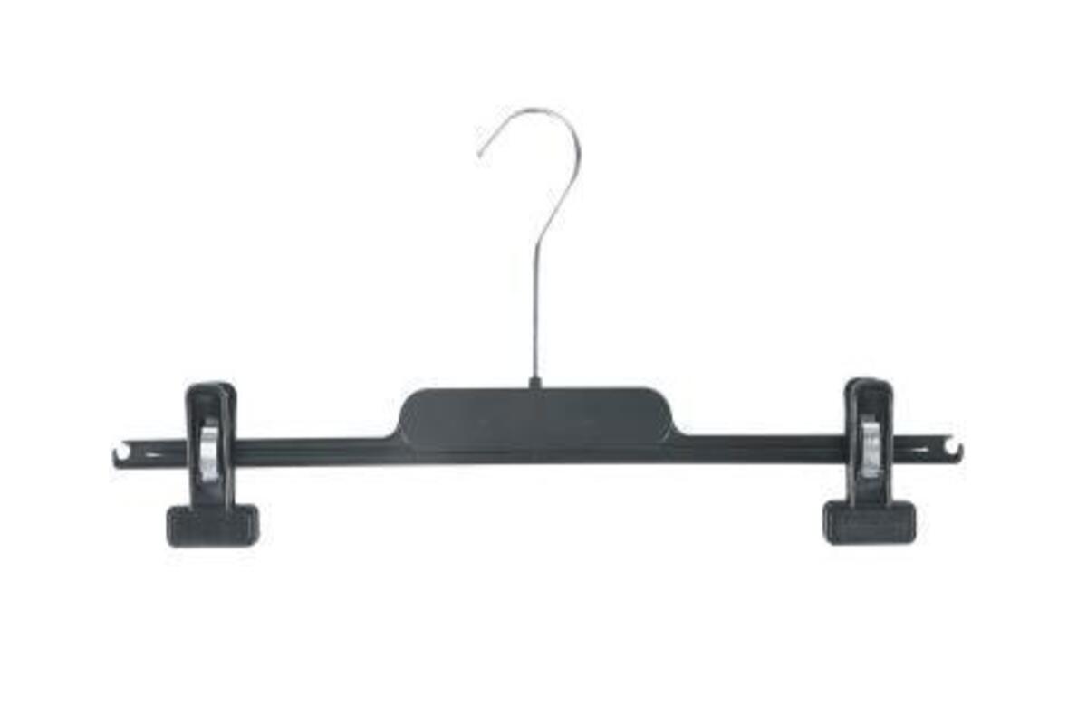 These hangers are designed with durable plastic and features two adjustable clips to securely hold pants, skirts, or other garments. The strong metal hook swivels for easy hanging, while the lightweight frame ensures optimal space-saving storage. Ideal for retail displays use, these hangers offer a practical solution for keeping clothes organized and wrinkle-free.