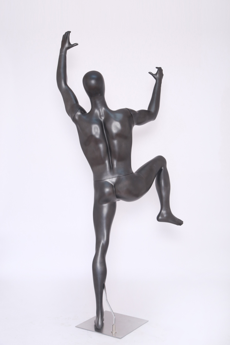 A rugged and dynamic male mannequin expertly crafted from fiberglass with a matte black finish, captured in a realistic climbing posture with arms raised and body positioned for vertical ascent. Perfect for showcasing outdoor gear, athletic apparel, climbing equipment, and adventure accessories with an authentic sense of motion and strength. This model features defined muscular proportions and realistic anatomical details, optimized for displaying climbing harnesses, performance jackets, tactical gear, sports watches, and technical footwear. The weighted base ensures exceptional stability while maintaining the dramatic illusion of upward movement. Manufactured from high-quality fiberglass, it combines impact-resistant durability with lightweight portability for effortless repositioning. Designed for outdoor retailers, sportswear brands, and adventure equipment stores seeking to create immersive visual merchandising displays that emphasize athletic performance and exploratory spirit.