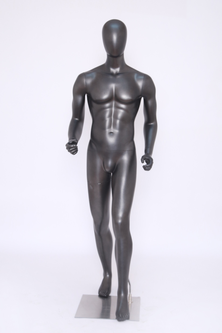 A dynamic and athletic male mannequin masterfully crafted from fiberglass with a sophisticated matte black finish, captured in a mid-action skiing stance with one foot positioned confidently on a skateboard. Perfect for showcasing sportswear, athletic apparel, action sports gear, and urban streetwear with a sense of motion and energy. This model features defined masculine proportions and realistic muscular detailing, optimized for displaying ski goggles, helmets, performance jackets, sneakers, and technical accessories. The integrated skateboard base ensures exceptional stability while creating an engaging illusion of movement. Manufactured from high-quality fiberglass, it combines durability with lightweight portability for effortless repositioning. Designed for sports retailers, outdoor adventure stores, and lifestyle brands seeking to create captivating visual merchandising displays that emphasize athleticism and contemporary style.