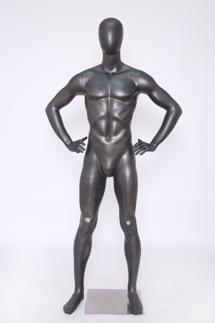 A stylish and elegant full-body male mannequin crafted from fiberglass with a matte black finish. Perfect for displaying men's formalwear, coats, jackets, trousers, and accessories, including hats, footwear, and bags. This is a universal model of a standard size with proportionate and well-defined masculine features that highlight the aesthetics of the male form. The stable base ensures it stands securely on any display floor or showcase. The manufacturing material is high-quality fiberglass, which guarantees a lightweight yet durable construction for long-lasting use. Its purpose is for sophisticated visual merchandising, creating compelling presentations in retail environments, and professional photography.