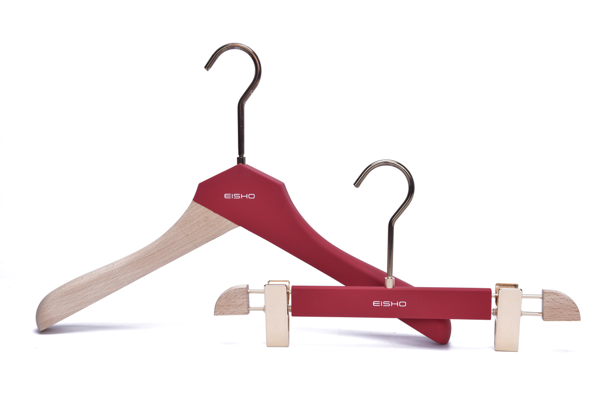 This set of hangers features a unique and vibrant design, combining a bold red finish with natural wood textures, which adds a touch of elegance and warmth to any store display. The top hanger is designed with a broad structure that provides excellent support for tops, such as jackets, blazers, or dresses, helping maintain their shape. The bottom hanger is equipped with secure, adjustable clips and gold-tone metal accents that offer a sophisticated contrast to the red wood finish.