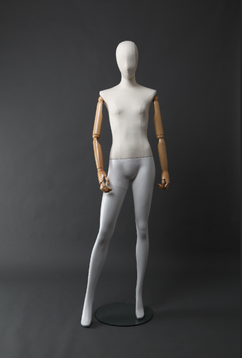 Window Display Cloth Body Full Body Wholesale Female Mannequin with Flexible Wooden Arms. Abstracte female mannequin, abstract head and torso overlaid with a beige linen fabric, fiberglass legs, 2 sets of arms, namely 1 pair of fiberglass lags white color and 1 pair of wooden adjustable arms, natural wood brut, standing pose, foot and calf pin.The luxurious female full body mannequin with leisure standing pose. The upper half body carefully covered by linen which makes her premium and natural feeling. Simplified face weaken the mannequin itself but emphasize the clothing when display. She is the perfect option for retailing clothing on various style and add the atmosphere when put her with group in the window or store. If measurement or poses changed wanted, please feel free to contact to adjust or customized.