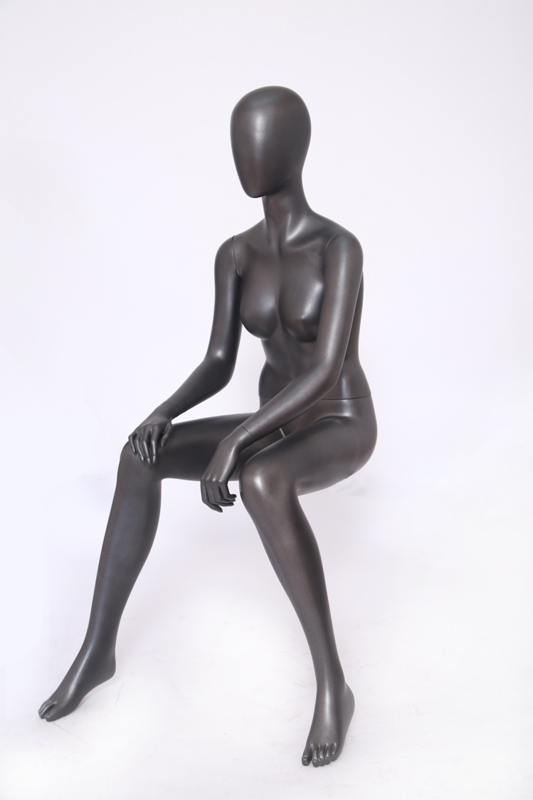 An elegant seated female mannequin crafted from high-quality fiberglass with a sophisticated matte black finish. Perfect for dynamically displaying garments in a seated position, such as dresses, skirts, trousers, as well as accessories and footwear. The mannequin features a gracefully sculpted pose with refined anatomical details, allowing for the creation of realistic and engaging visual compositions. Its stable and balanced construction ensures secure placement on display platforms or in exhibition settings. The lightweight yet durable material guarantees both ease of handling and long-term reliability. Designed for high-end visual merchandising, retail displays, and professional fashion photography.