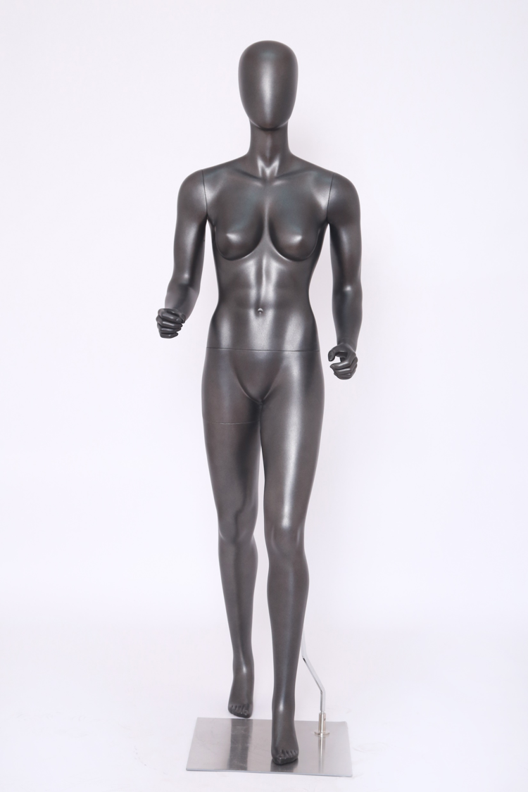 PA sleek and dynamic female mannequin masterfully crafted from fiberglass with a sophisticated matte black finish, captured in an energetic skiing stance with one foot positioned gracefully on a skateboard. Perfect for showcasing women's athletic wear, snow sports gear, action-ready accessories, and urban streetwear with a sense of motion and modern style. This model features toned feminine proportions and realistic anatomical details, optimized for displaying ski goggles, helmets, performance jackets, athletic leggings, sneakers, and technical accessories. The integrated skateboard base ensures reliable stability while creating a compelling illusion of dynamic movement. Manufactured from high-quality fiberglass, it combines durability with lightweight portability for easy adjustment and repositioning. Designed for sports retailers, ski shops, and contemporary fashion brands aiming to create eye-catching visual merchandising displays that emphasize strength, agility, and adventurous style